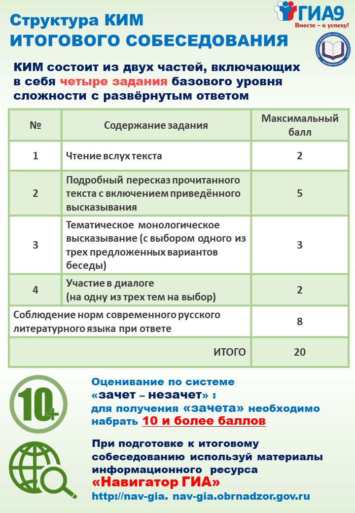 Итоговое собеседование направлено на проверку коммуникативной компетенции обучающихся IX классов — умения создавать монологические высказывания на разные темы, принимать участие в диалоге, выразительно читать текст вслух, пересказывать текст с привлечением дополнительной информации.