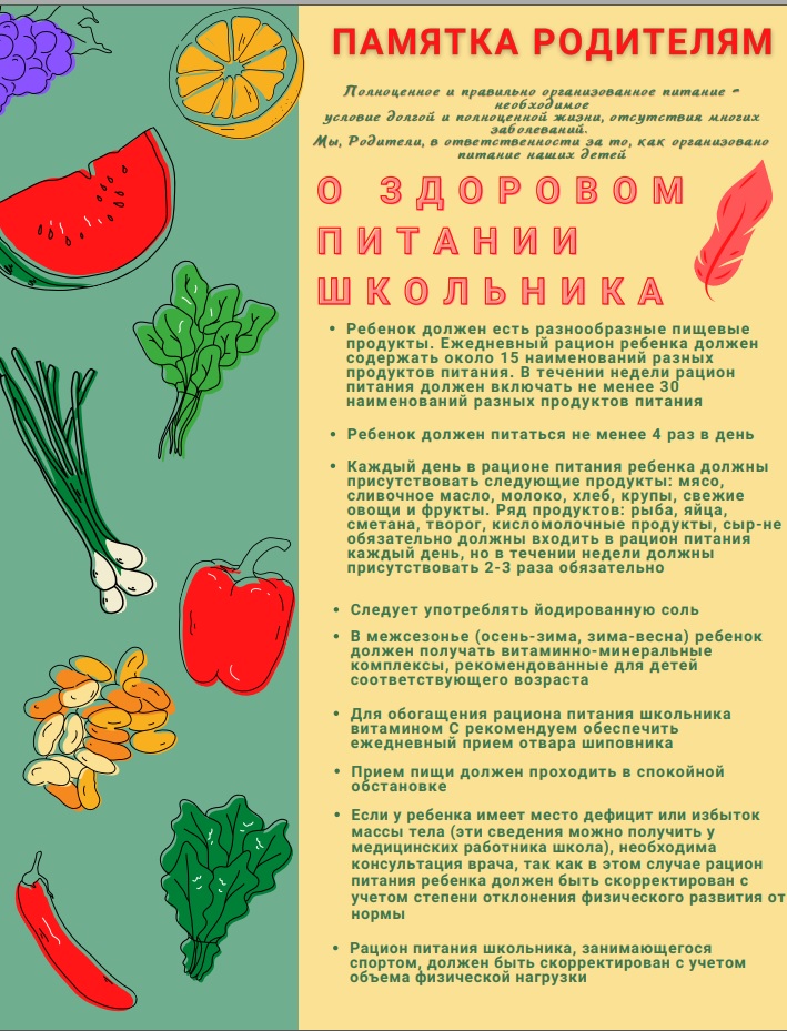 Здоровое питание школьников в руках родителей и не стоит недооценивать важность здорового питания в семье. Если вся семья привыкла питаться сбалансировано, то и ребёнок с детства будет приучен не к быстрым бутербродам с копчёной колбасой на завтрак, а к пище, которая способна дать заряд на целый день, и даёт необходимые витамины и микроэлементы, важные в любом возрасте!